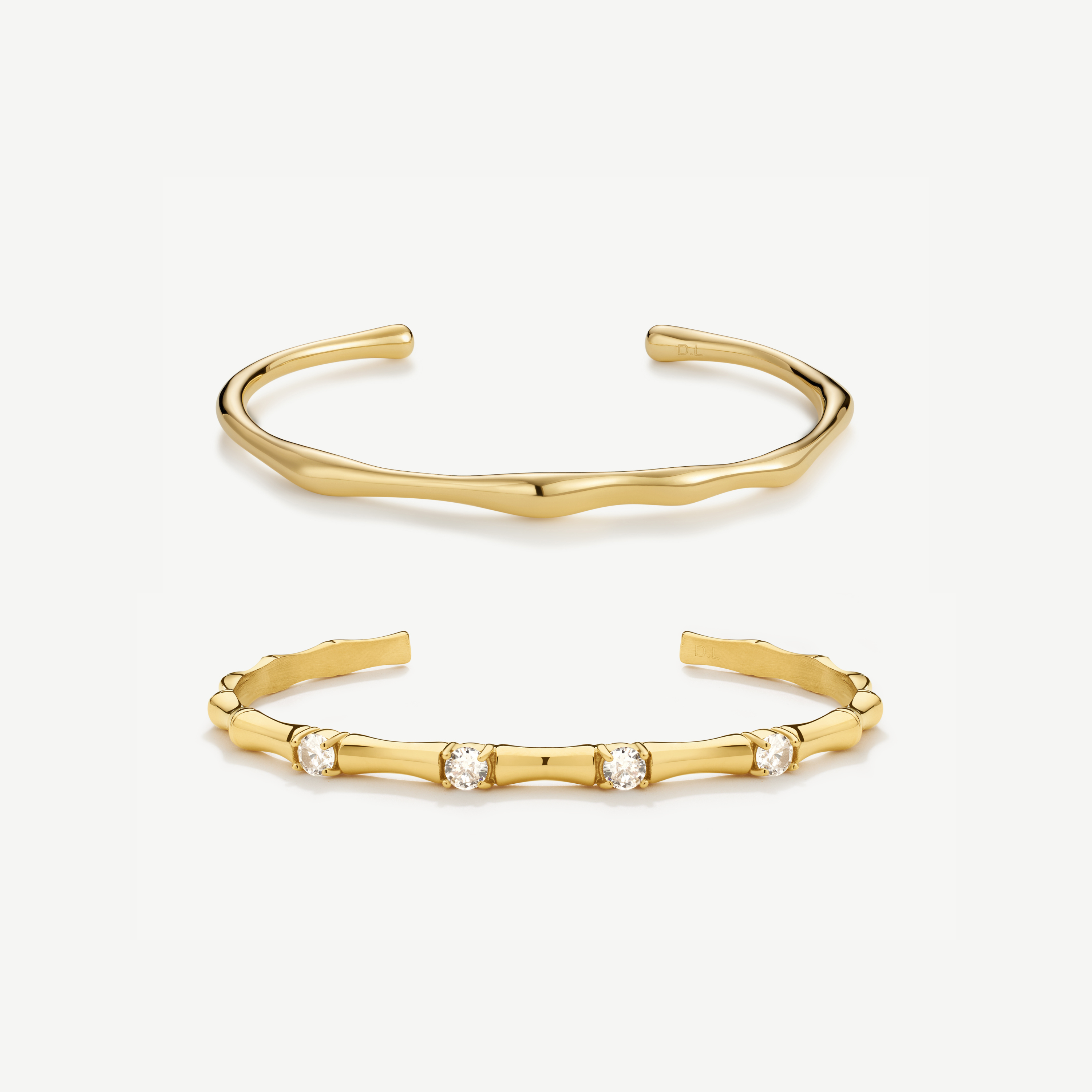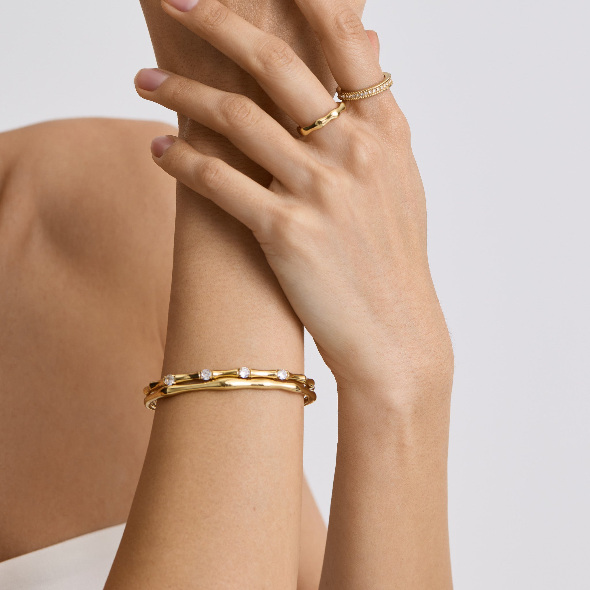 Elevate your bracelet stacks with our Bamboo Bangle duo. This stunning cubic zirconia twist adds a touch of sparkle perfectly paired with our classic bamboo bangle.