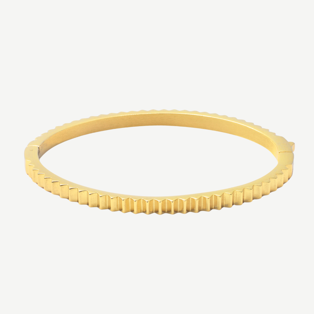 A modern twist on the classic bangle. Featuring a gold pleated design, this sleek and stylish design adds a touch of elegance to any outfit.