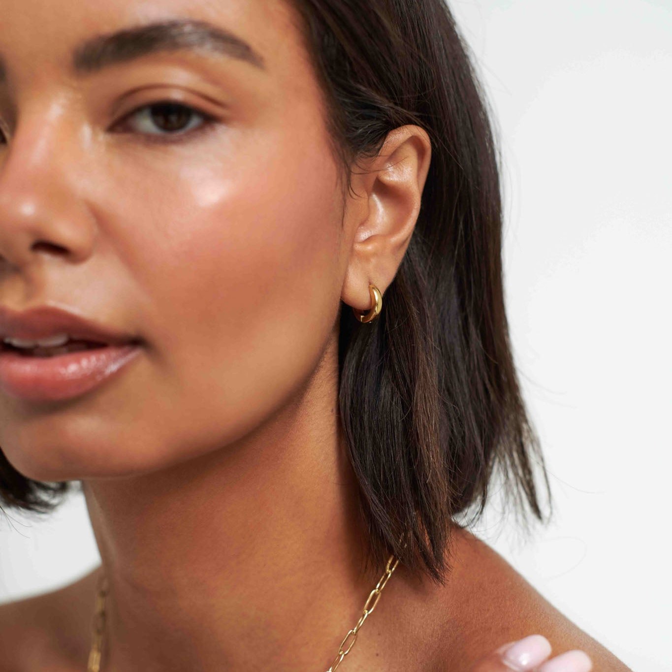 A smaller design might make you think twice about wearing hoop earrings, but not these. These thin gold hoops are understated and cool. Hang these tiny treasures in the second piercing for a modern look.