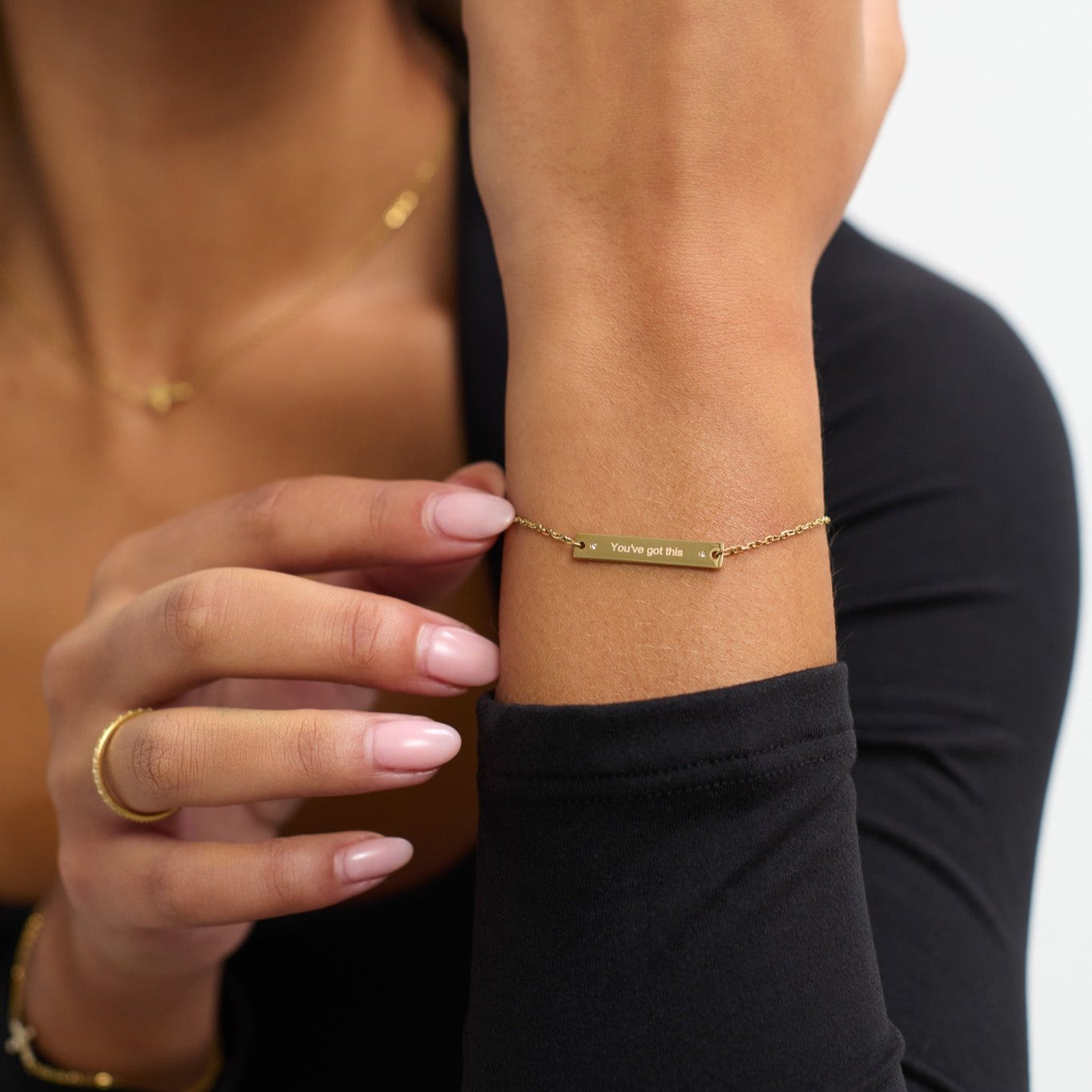 This delicate bracelet features a customizable disc and subtle cubic zirconia stones, allowing you to add a personal touch to your bracelet stack and create a one-of-a-kind piece.