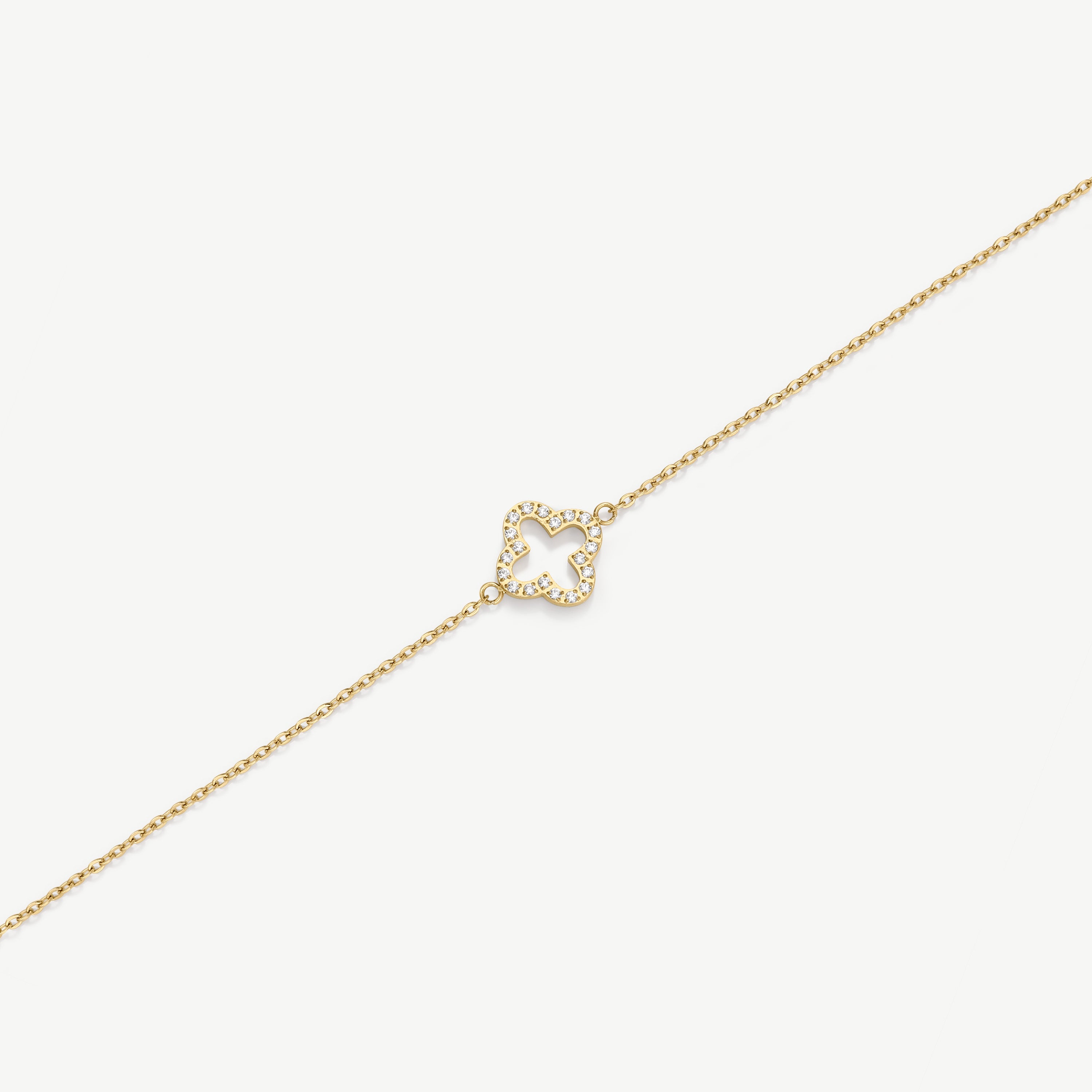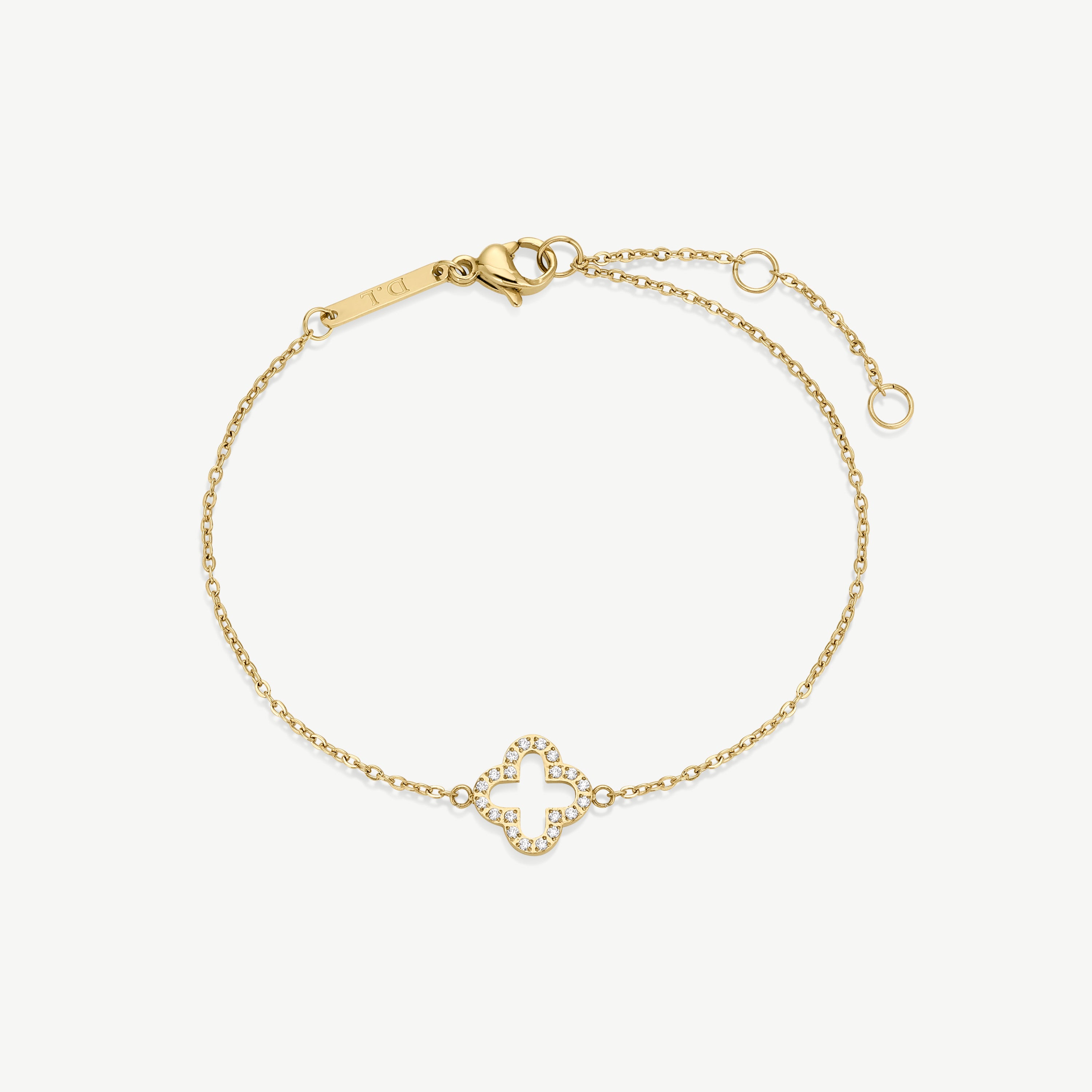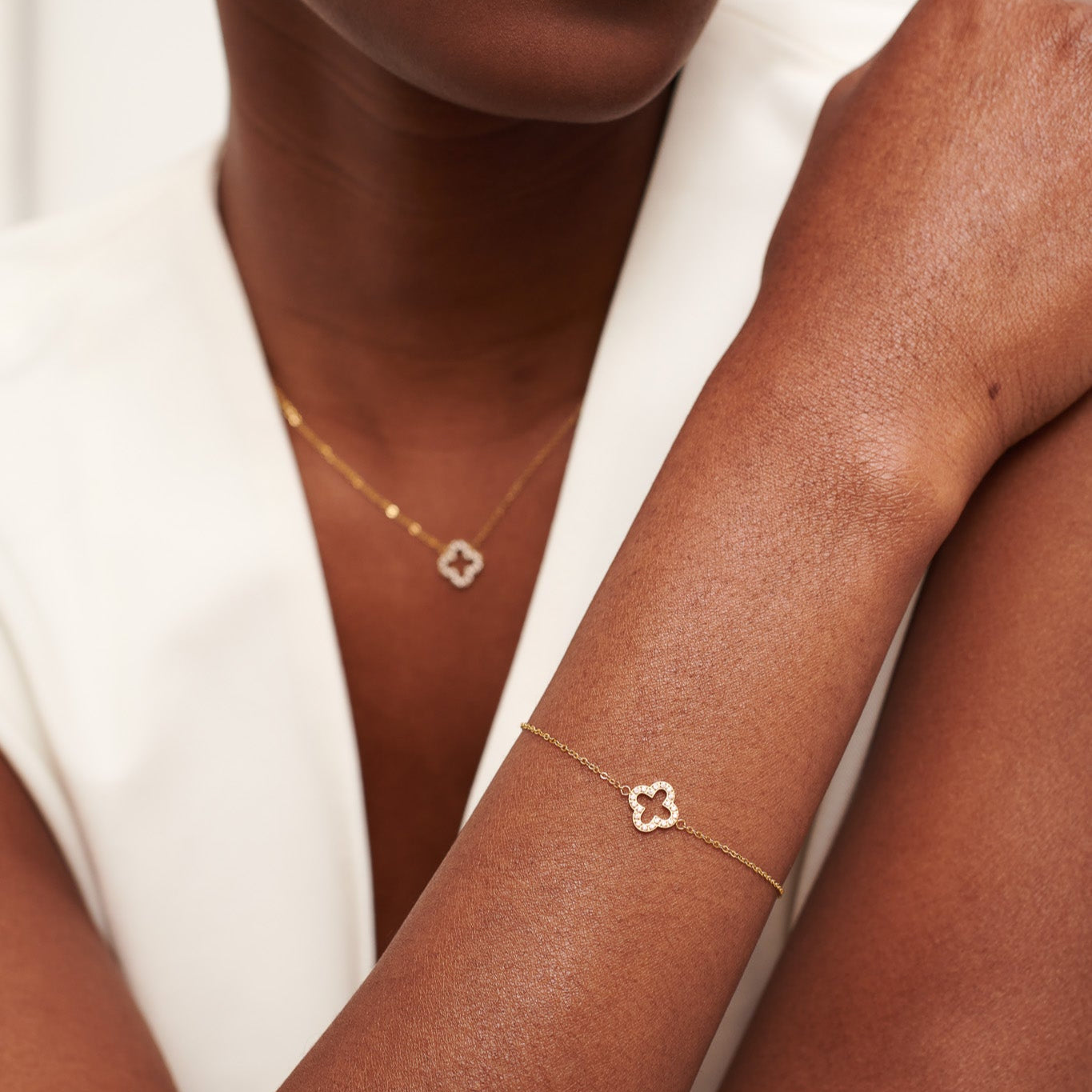 The Pavé Clover Bracelet is a beautiful addition to any jewelry collection. Its delicate outlined design and pavé details add a touch of glamour to any bracelet stack.