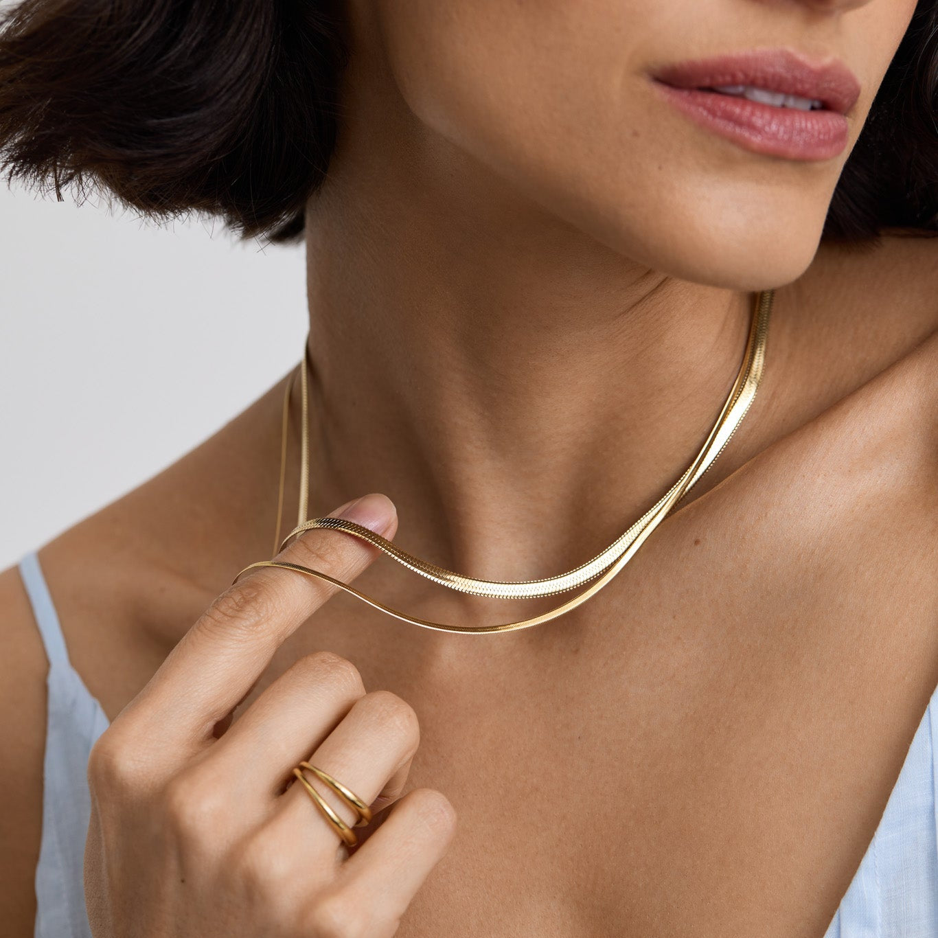 This is our best seller at D Louise. This necklace is a modern classic. Sleek gold herringbone chain that will add a delicate touch to any outfit on its own, or layered with other necklaces for a stylish look.