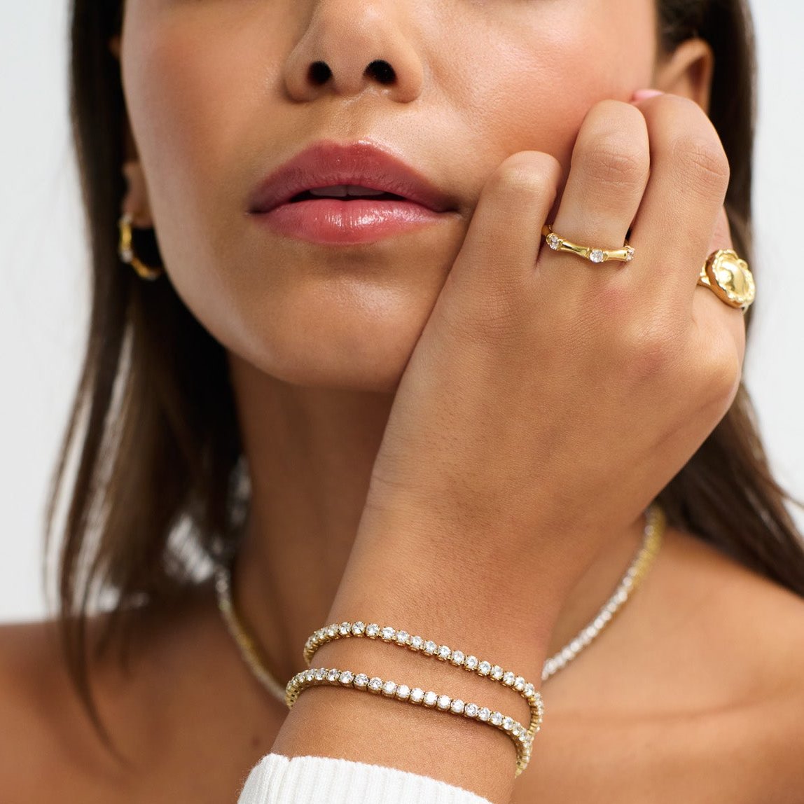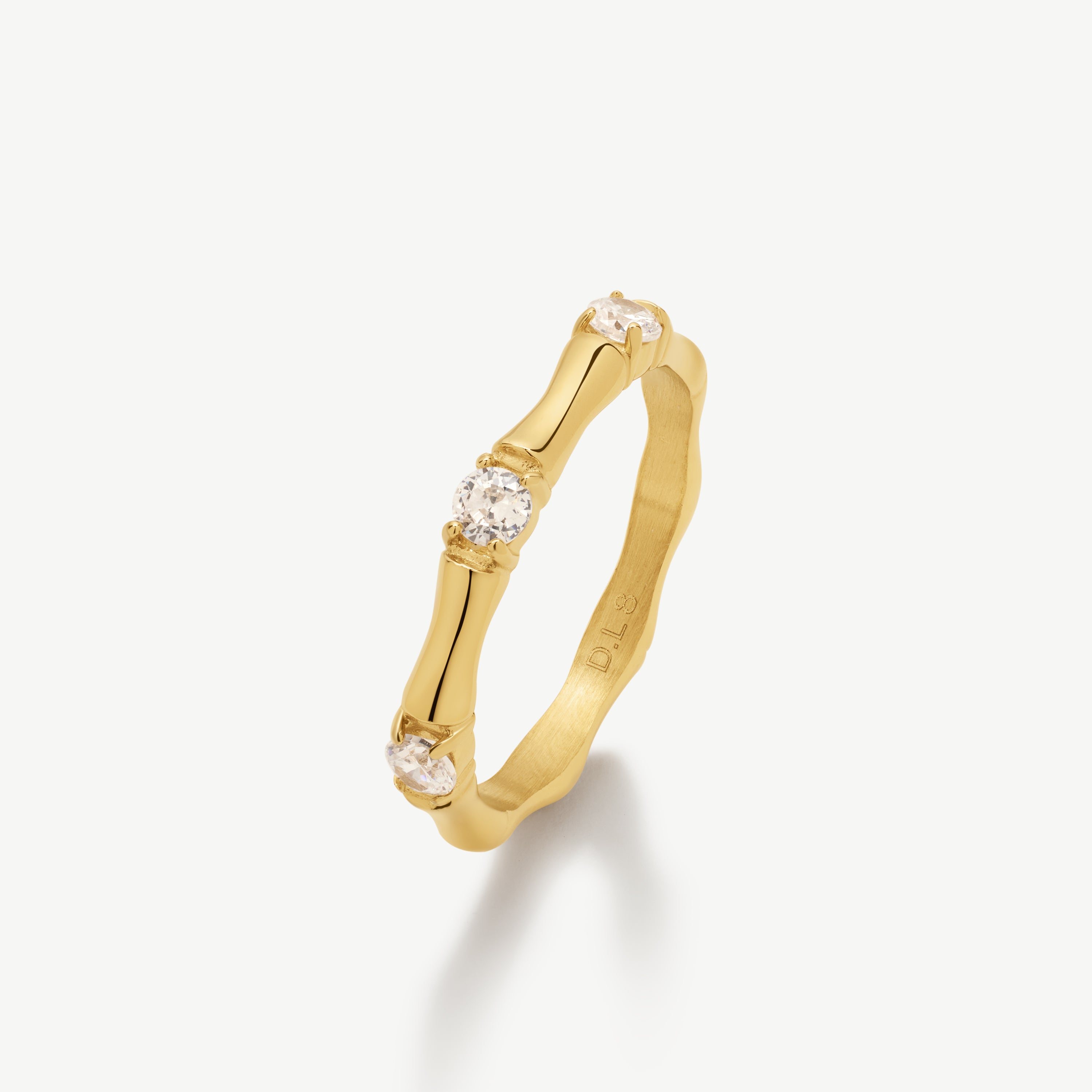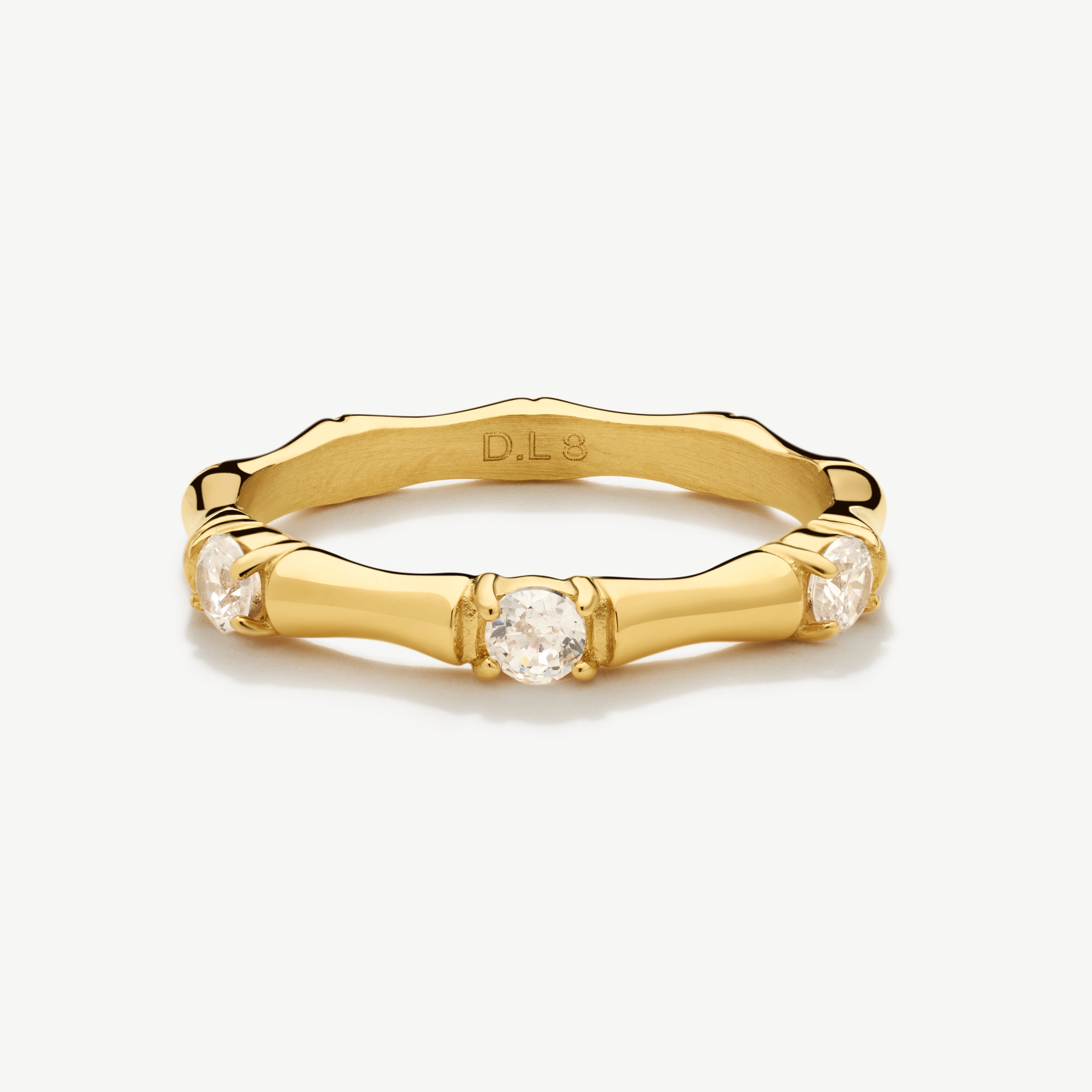 Introduce a touch of glamour to your ring stack with our Bamboo Ring With Stones. This modern design is elevated by timeless cubic zirconia details, making it a versatile addition to your jewelry collection.