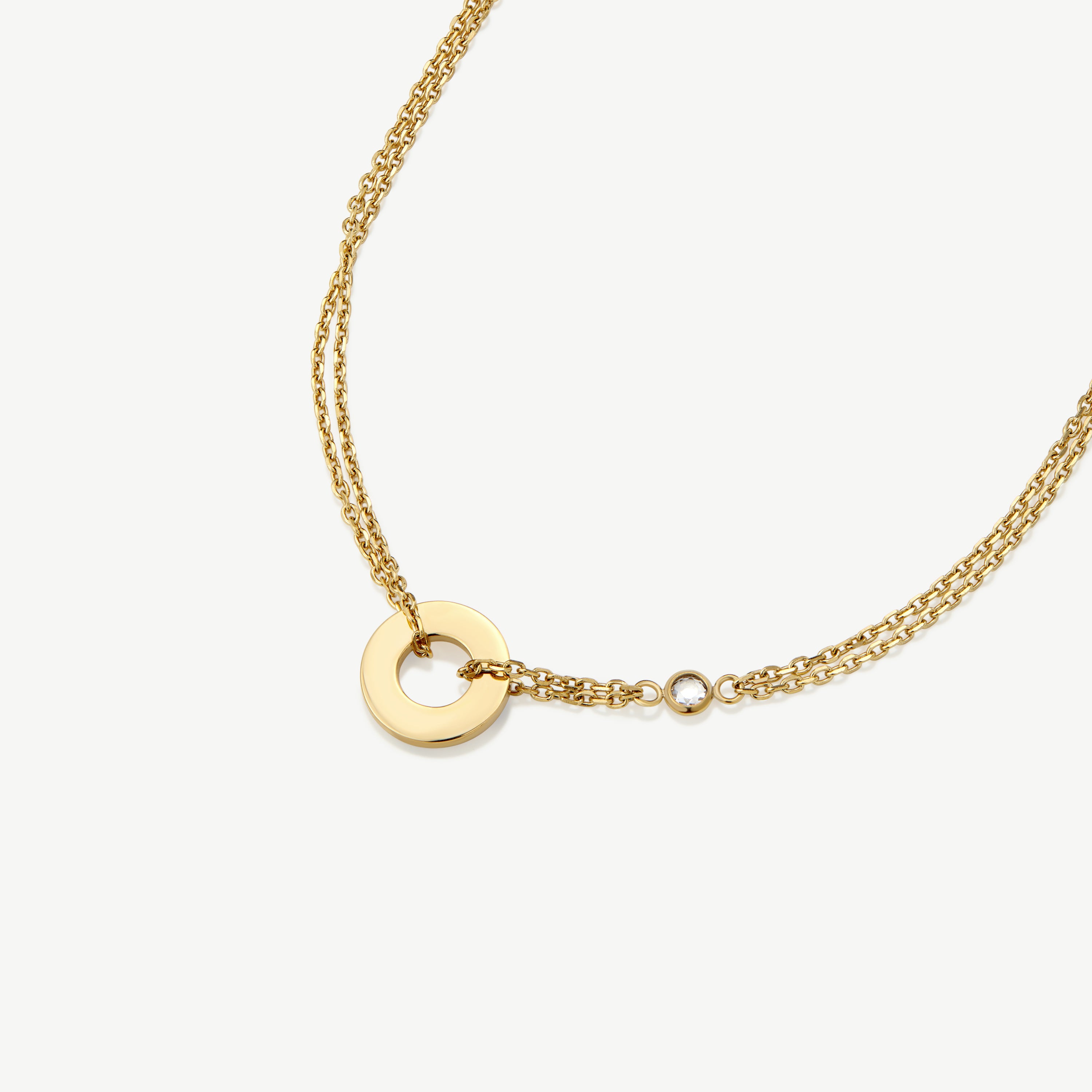 The Halo Disc Pendant With Stone is a modern take on a timeless piece. Its halo design, enhanced by a cubic zirconia stone, adds a touch of effortless elegance to any outfit.