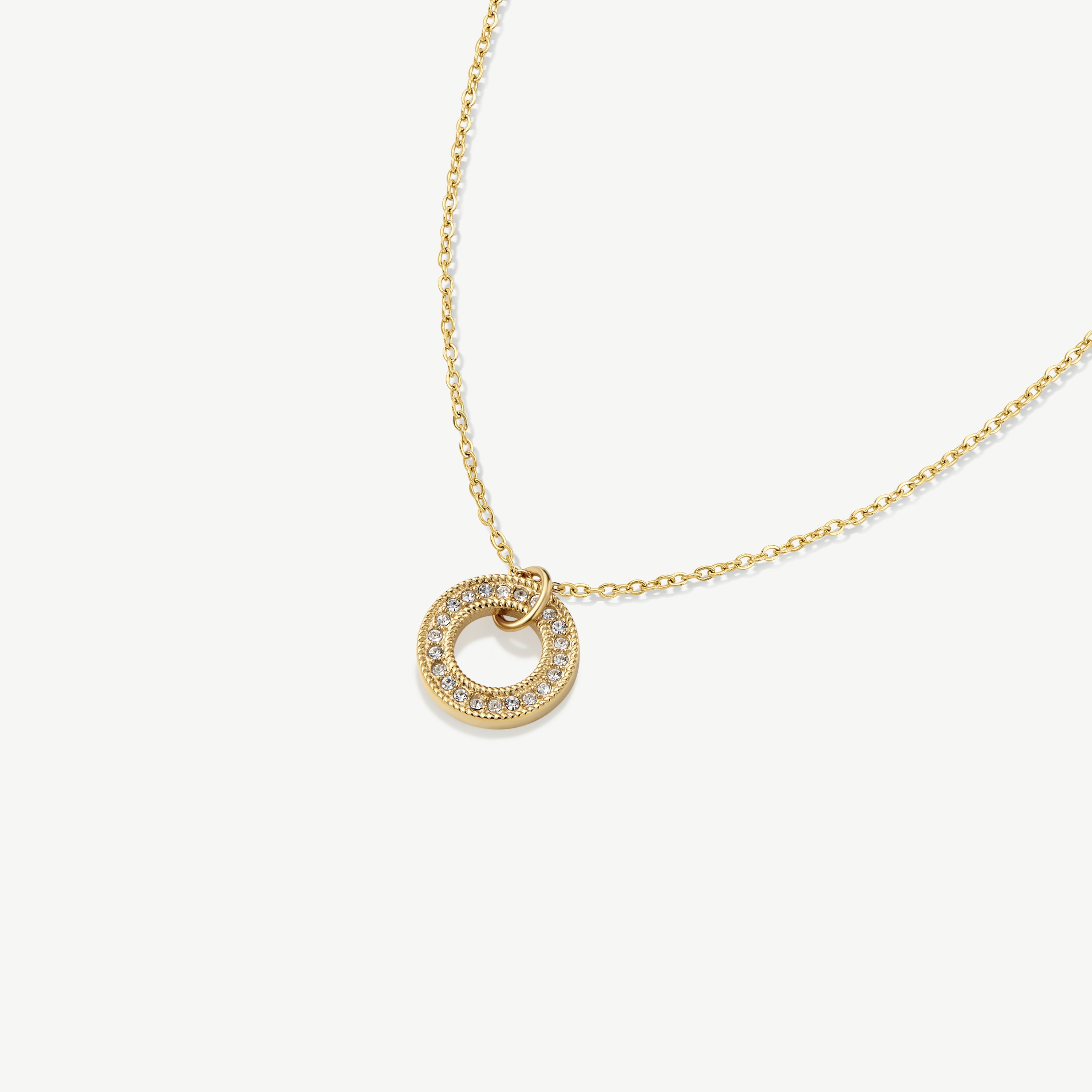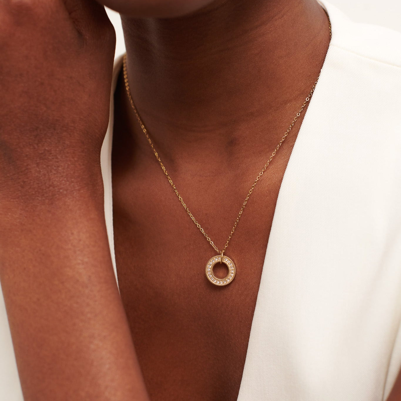 This elegant pendant necklace features a stunning outline design with intricate pavé embellishments and textured details.